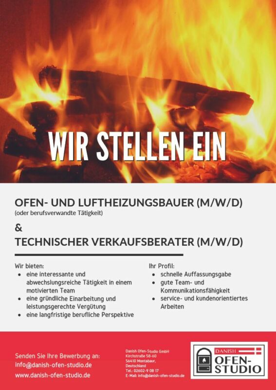 Wir vom Danish Ofen-Studio sind Spezialisten für Öfen, Kamine und Heizlösungen und suchen ab sofort engagierte neue Kolleginnen und Kollegen für folgende Positionen: